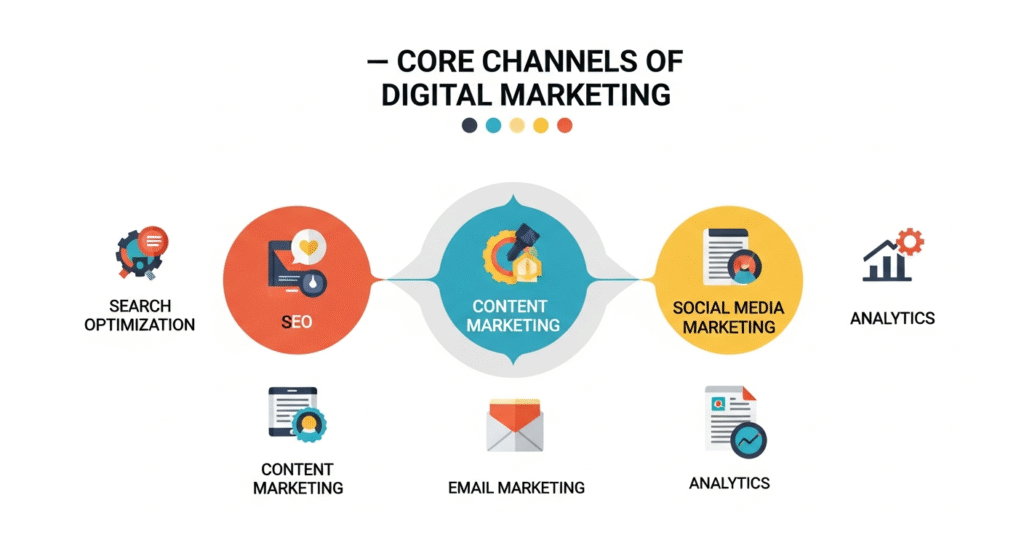 Digital marketing is the practice of promoting products, services, or content through digital channels — such as search engines, social media platforms, email, websites, apps, and online advertising networks. Unlike traditional marketing (TV, radio, print), digital marketing is measurable, targeted, and often low-cost. The major disciplines inside digital marketing include: