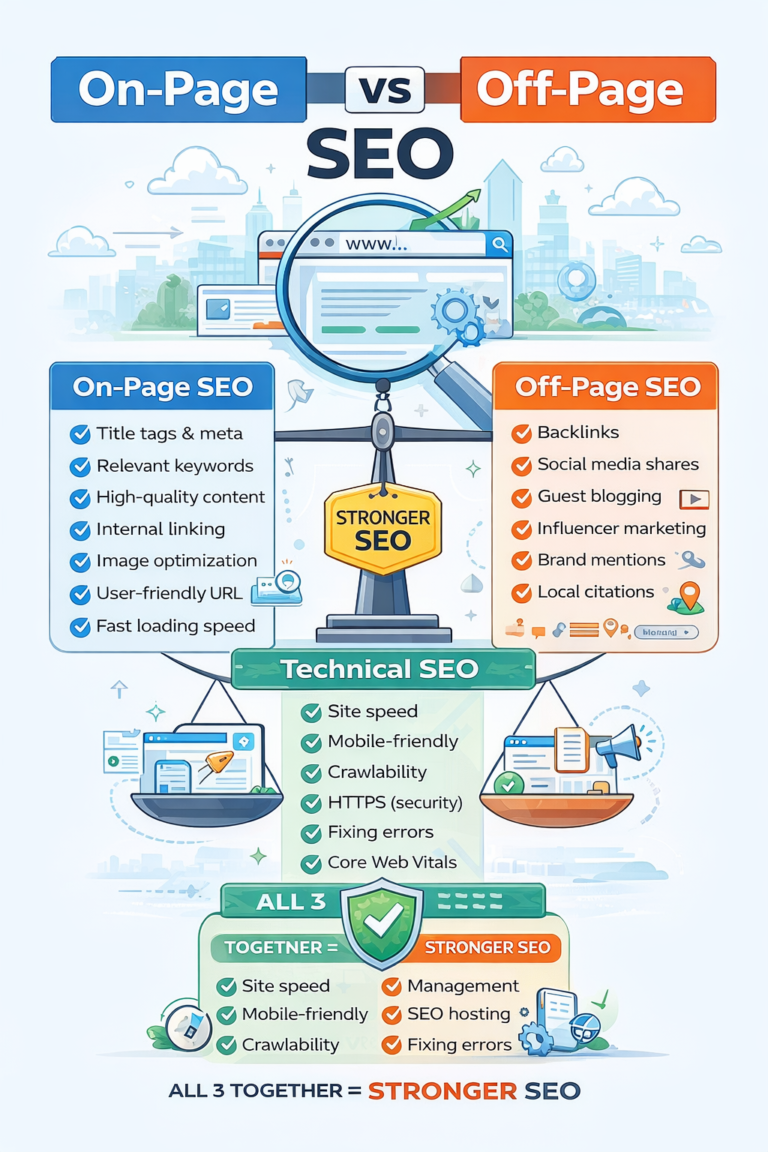 This explains on page seo vs off page seo vs technical seo in a clear way.